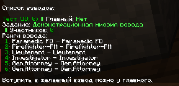 | /platoon <mark style="color:green;">list</mark>                                                                                           | Список взводов в организации                                                                  |